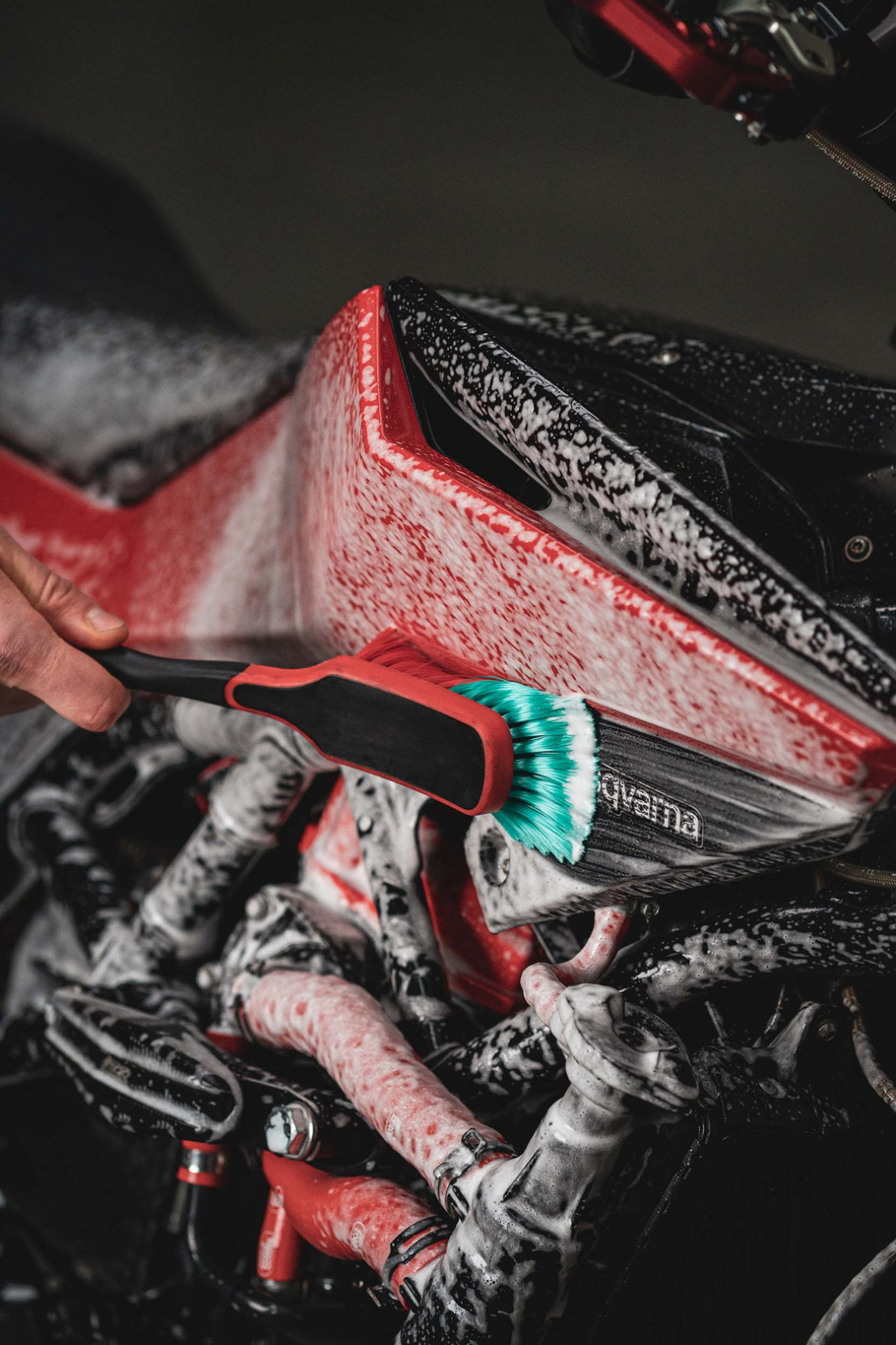 Toarnă în dispozitivul de spumare soluție pentru curățarea motocicletei și amestec-o cu apă. Acționează butonul conic din partea de sus a dispozitivului de spumare, pentru a-l pune sub presiune, apoi pulverizează soluția pe suprafața motorului. Lasă spuma să acționeze timp îndelungat (maximum 5 minute), apoi utilizează peria pentru curățarea motorului sau buretele din vâscoză. Datorită timpului îndelungat în care soluția acționează, nu vei mai fi nevoit să freci atât de mult suprafața motorului și vei termina rapid de curățat! După clătire, șterge motorul cu laveta P.U., din material sintetic, pentru a obține o curățare fără urme!